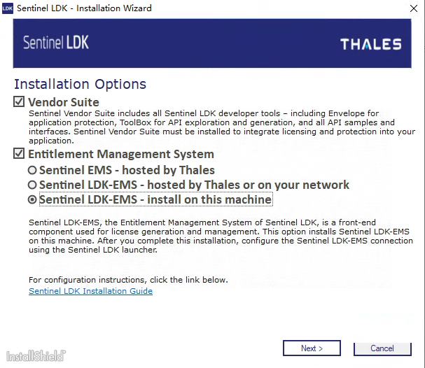 9、安裝過(guò)程中出現(xiàn)這個(gè)界面時(shí),除了前面兩個(gè)框打勾外,下面那個(gè)請(qǐng)選擇”Sentinel LDK EMS –install on this machine”